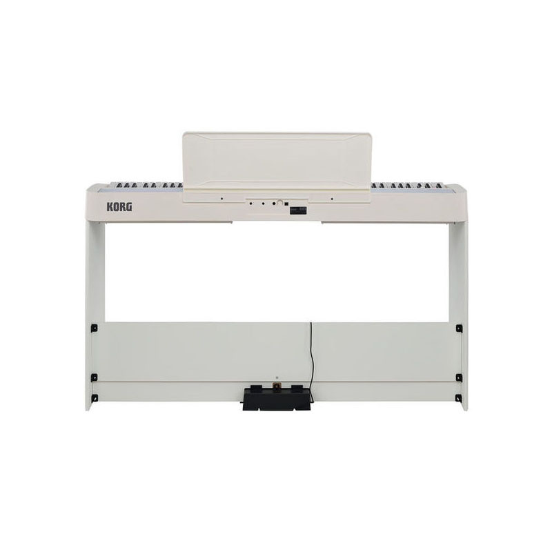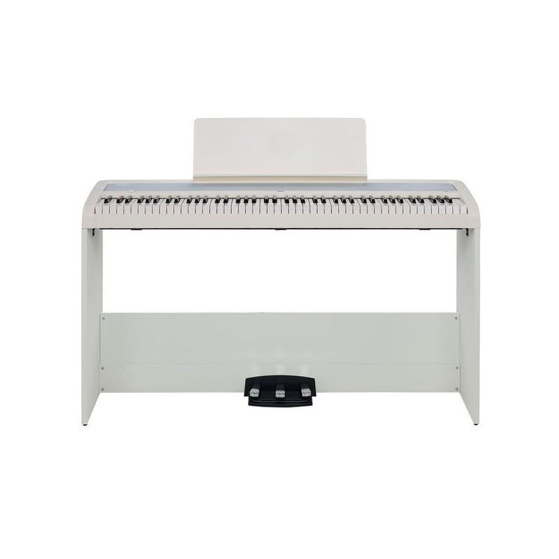 Questo set comprende il pianoforte digitale B2, un supporto di facile montaggio e un'unità a tre pedali, un insieme che offre l'esperienza di suonare un vero pianoforte a coda. Questo modello include tutto ciò che serve per divertirsi a suonare il piano seriamente. Utilizza una tastiera Natural Weighted Hammer Action (NH), che simula la sensazione tattile prodotta dalla differenza di peso dei martelli tra il registro grave ed acuto di un pianoforte acustico; mentre un elevato livello di sensibilità consente la riproduzione di un'ampia gamma dinamica. La dotazione di connessioni consente di utilizzare lo strumento con un'ampia varietà di combinazioni software e hardware. Questo apre nuove possibilità di utilizzo per un pianoforte digitale, che può diventare uno strumento di reale ausilio sia per la didattica che per la creazione musicale. La porta USB del Korg B2 può essere utilizzata per collegarsi a smartphone, tablet, o pc, usando il piano come controller MIDI per moduli sonori esterni. Inoltre, i dati d'esecuzione sul B2 possono essere registrati su uno smartphone, mentre i suoni da questo generati possono essere ascoltati tramite il sistema di amplificazione del B2. E' possibile controllare la risposta dinamica della tastiera su tre diversi livelli di sensibilità: Light, Normal, Heavy, selezionabili in base alla tecnica o alle preferenze esecutive individuali, adattando così lo strumento al proprio stile. Sono inoltre disponibili due effetti: riverbero e chorus. L'unità PU-2 di Korg è un sistema a tre pedali che replica efficacemente le tre funzioni del sistema a tre pedali di un pianoforte acustico: sustain, soft e damper. Il Korg B2 viene fornito con una versione free dell'app Skoove con 25 lezioni gratuite per l'apprendimento del pianoforte.