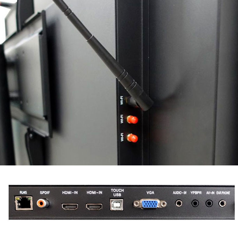 3 HDMI, Component, Analog D-Sub, DVI-D, Audio-in, Audio out, RS232 in/out, TV-USB(3.0), 2 USB-B, 3 USB 2.0, 2 Touch out, Touch in